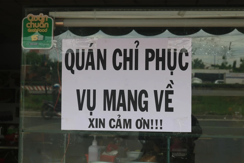 Một quán nhậu tại TP Thủ Đức dán thông báo chỉ bán mang về. Ảnh: KHÁNH CHI