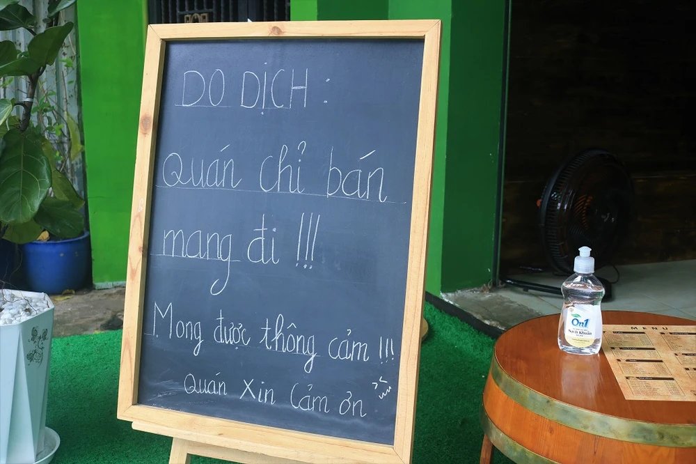 Quán của anh Phạm Bảo thông báo bán mang về, có nước rửa tay cho khách hàng. Ảnh: KHÁNH CHI