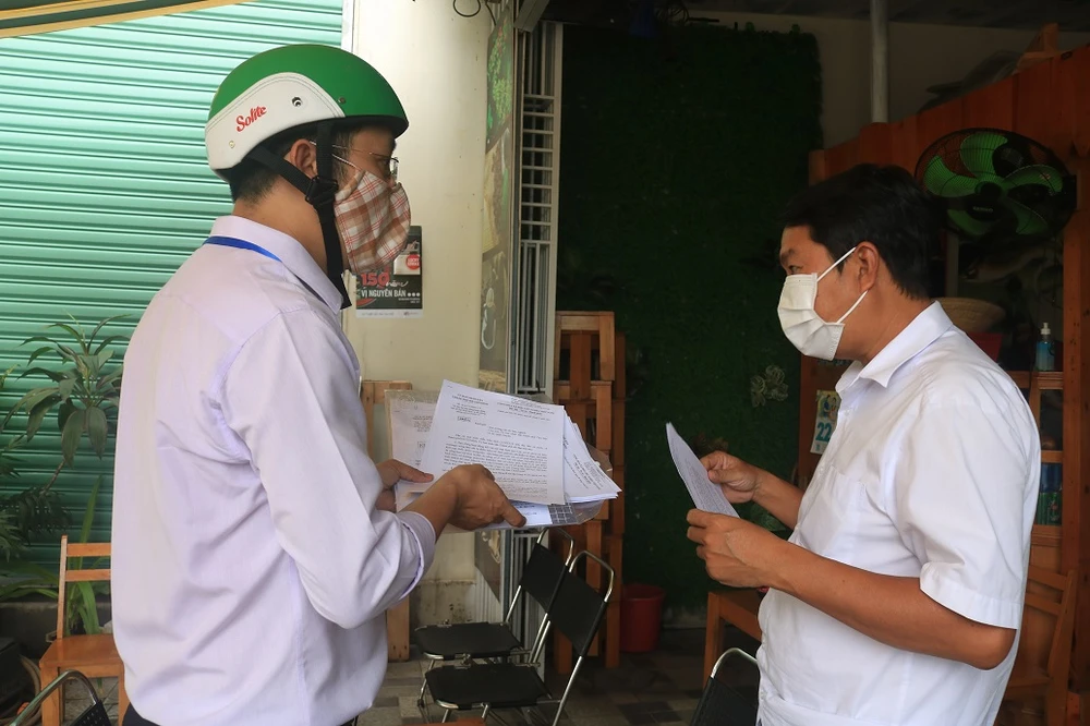 Tại phường Phước Long A, TP Thủ Đức, những quán vẫn còn đón khách bán tại quán được cán bộ UBND phường tới nhắc nhở. Ảnh: KHÁNH CHI