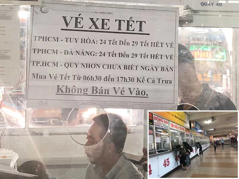 Nhiều quầy vé tại Bến xe Miền Đông đã dán bảng thông báo hết vé. Ảnh nhỏ: Tại các quầy vé ở Bến xe Miền Đông chỉ có lác đác hành khách tới mua vé. Ảnh: ĐÀO TRANG