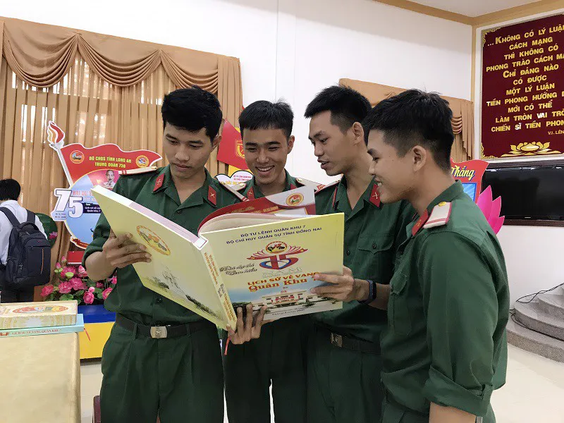 Cán bộ chiến sĩ Quân khu 7 xem kỷ yếu về 75 năm ngày truyền thống Quân khu 7. Ảnh: THANH TUYỀN