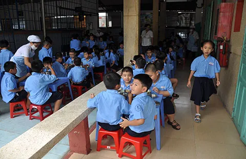 Hơn 100 HS Trường Tiểu học Nguyễn Khuyến (quận 12) bị sốt trong ba ngày qua. Trong ảnh: Giờ ăn trưa của HS Trường Tiểu học Nguyễn Khuyến. Ảnh: TRẦN NGỌC