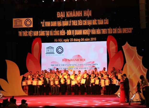 Chiều 23-4, chương trình Đại khánh Hội “lễ vinh danh “Nhà quản lý theo tiêu chí đạo đức toàn cầu, Trí thức Việt Nam sáng tạo và cống hiến, đơn vị, doanh nghiệp, doanh nhân văn hóa theo tiêu chí của Unesco” đã diễn ra tại Cung văn hóa Hữu nghị Việt - Xô Hà Nội.