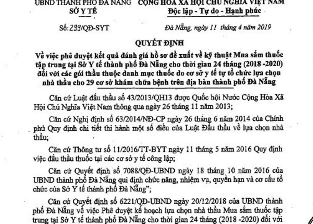 Quyết định về việc đấu thầu giá thuốc vừa được Giám đốc Sở Y tế Đà Nẵng ký.