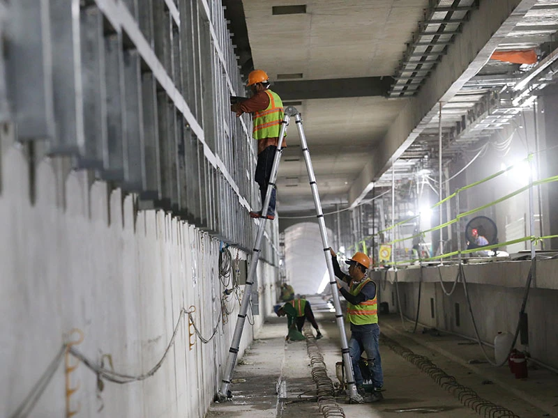 Công nhân làm việc tại ga ngầm Ba Son của tuyến metro số 1. Ảnh: HOÀNG GIANG