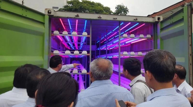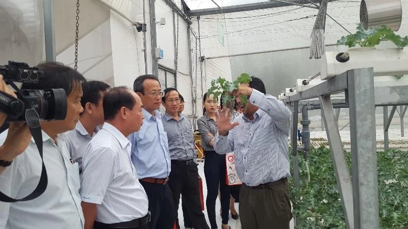 Đoàn lãnh đạo báo chí tham quan khu trồng rau trong container. Ảnh: PHƯƠNG THÙY