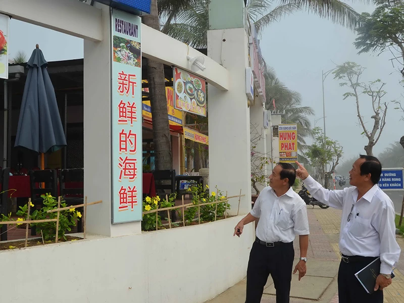 Cơ quan chức năng tại Đà Nẵng nhiều lần ra quân kiểm tra, xử lý các cửa hàng ven biển gắn biển hiệu toàn chữ Trung Quốc. Ảnh: TẤN VIỆT