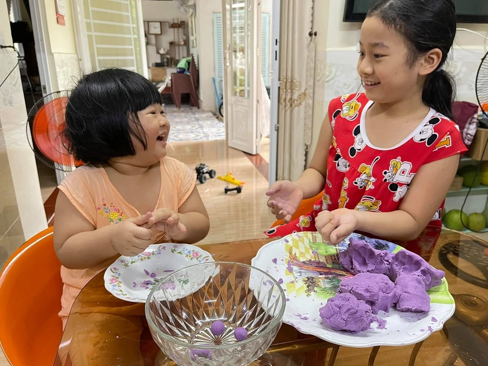 Khoảnh khắc vui vẻ của hai bé nhà chị Hồng Quỳnh khi cùng nhau nặn bột khoai tím để mẹ nấu chè. Ảnh: NVCC