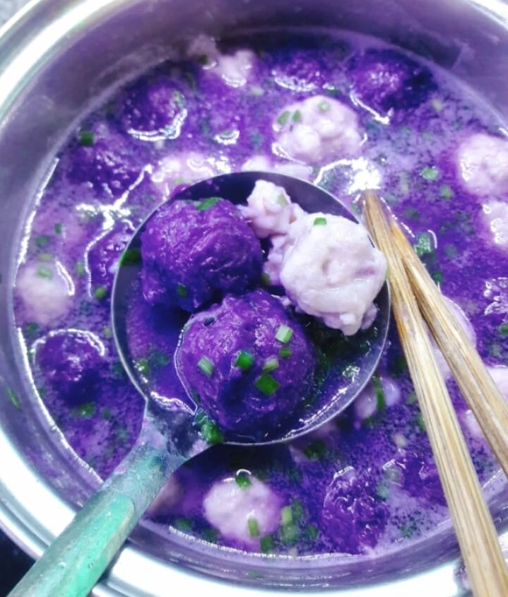 Món súp khoai lang tím nấu thịt xay. Ảnh: NVCC