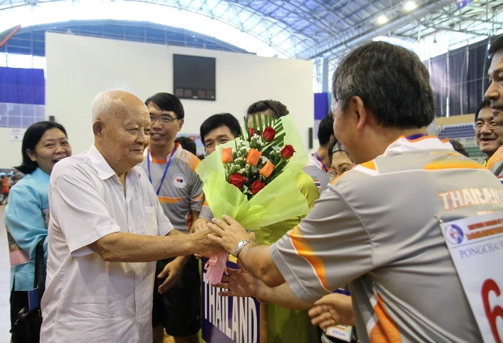Nguyên Tổng Cục trưởng Tổng cục TDTT Lê Bửu trao hoa cho các đội dự giải.