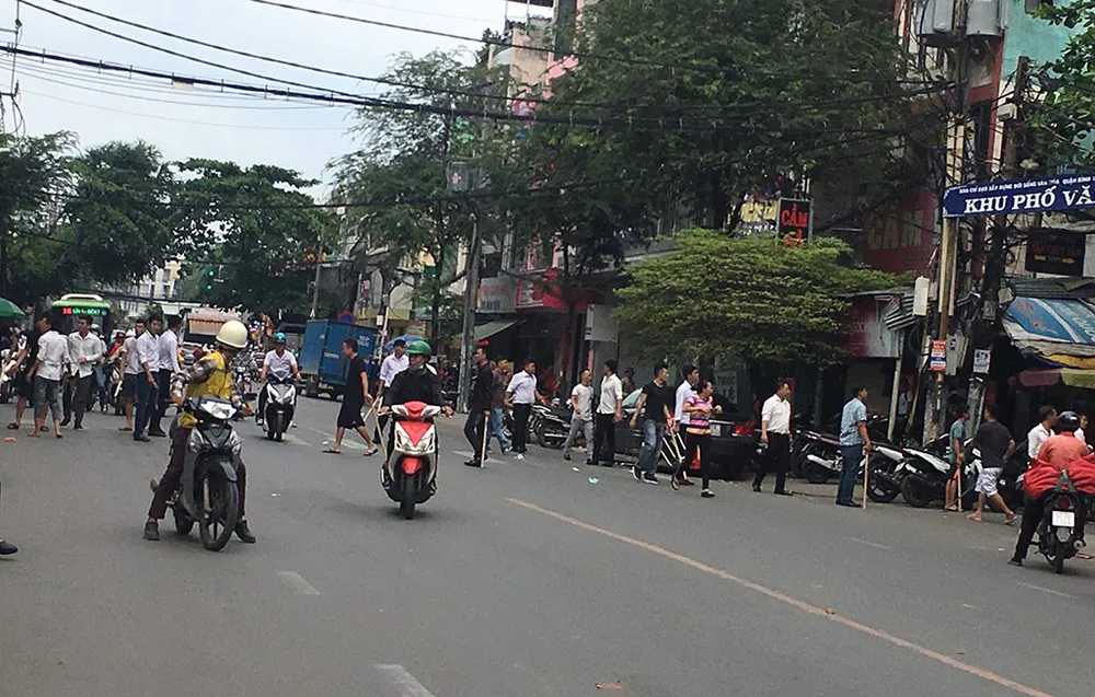 Tại khu vực xảy ra vụ việc vương vãi gạch đá, giày dép, gậy gộc. Nhiều người đi đường hốt hoảng tấp vào vỉa hè làm như vô can vì sợ vạ lây.