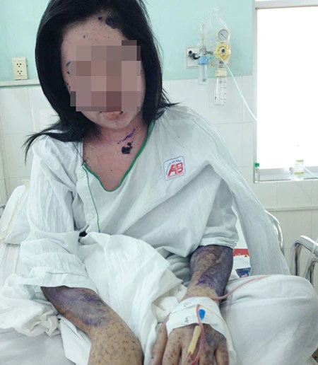 Do chị T. không nhập viện nên mãi đến gần hai ngày sau gia đình mới đưa chị vào BV An Bình, lúc này toàn thân chị T. đã bong tróc và có dấu hiệu nhiễm trùng. Ngay khi vào bệnh viện chị T. được cho thở máy đến bốn ngày.