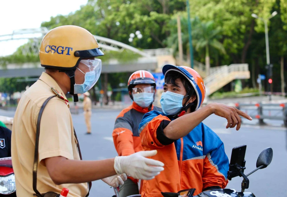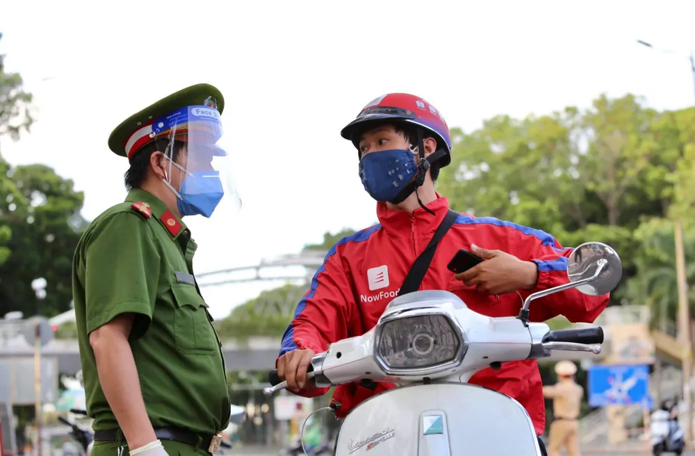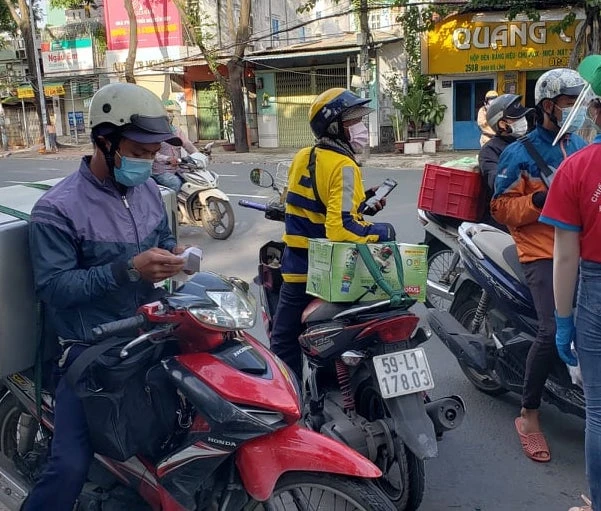 Các shipper di chuyển qua khu vực kiểm tra cũng được lực lượng chức năng kiểm tra giấy tờ, app giao hàng.