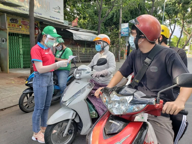 Một tình nguyện viên hỗ trợ lực lượng chức năng kiểm tra giấy đi đường người dân. Ảnh: TS