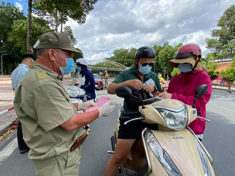 Ghi nhận vào khoảng 17 giờ, lượng xe lưu thông từ hướng TP Thủ Đức qua các chốt kiểm soát khá đông. Lực lượng CSGT, quân đội, Công an quận Bình Thạnh, dân quân tự vệ và đội ngũ tình nguyện viên phải làm việc rất cật lực để kiểm tra giấy tờ người dân.