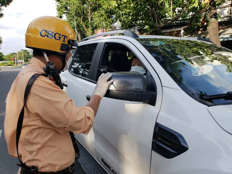Lúc 17 giờ 50, đoàn liên ngành gồm CSGT-TT quận Phú Nhuận và cán bộ UBND phường 9 bắt đầu triển khai kiểm tra đối với những người dân di chuyển trên đường Hoàng Minh Giám vào quận Phú Nhuận.