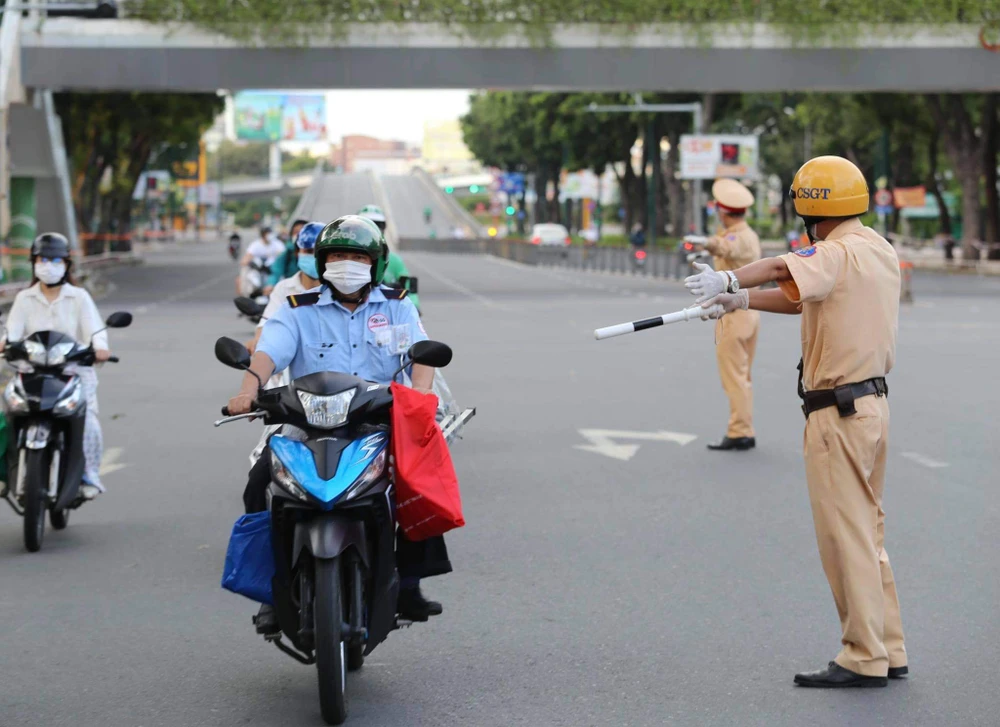 Đoàn liên ngành CSGT-TT quận Phú Nhuận và cán bộ UBND phường 9 kiểm tra đối với những người dân di chuyển trên đường Hoàng Minh Giám vào quận Phú Nhuận. Ảnh: HOÀNG GIANG