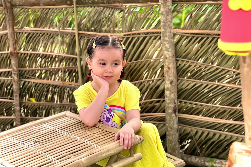 Gia đình anh Hải Hoàng và chị Thùy Linh cho con đến cánh đồng hoa hóng mát, và chụp ảnh lưu niệm.