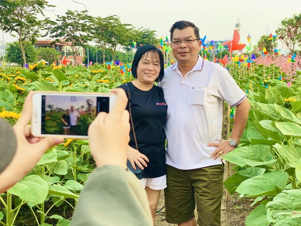 Ông Nguyễn Tài Vinh (60 tuổi, quận 3) cho biết, đây là lần đầu tiên đến tham quan vườn hoa hướng dương rộng lớn như thế này. “Tôi xem trên tivi thấy giới thiệu về cánh đồng hoa này, nên đạp xe gần 10km xuống đây chỉ để tham quan và chụp ảnh thôi. Già rồi, tôi xem đây là niềm vui chứ không thấy xa. Xuống đây, thấy hoa đã nở rất đẹp, không uổng công” - Ông Vinh cười nói.