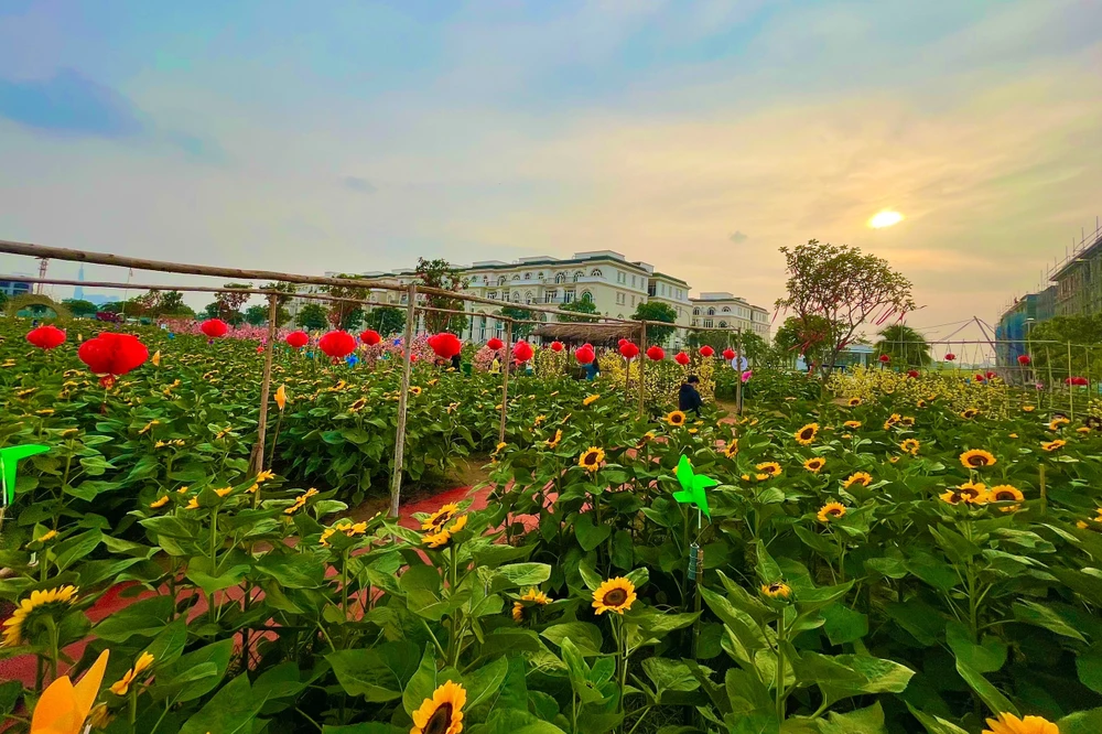 Cánh đồng hoa có diện tích 12.000m2 với khoảng 50.000 cây hoa hướng dương. Được trồng thành nhiều hàng dọc, đan xen tiểu cảnh Tết quê cho khách tham quan thoả sức chụp ảnh.