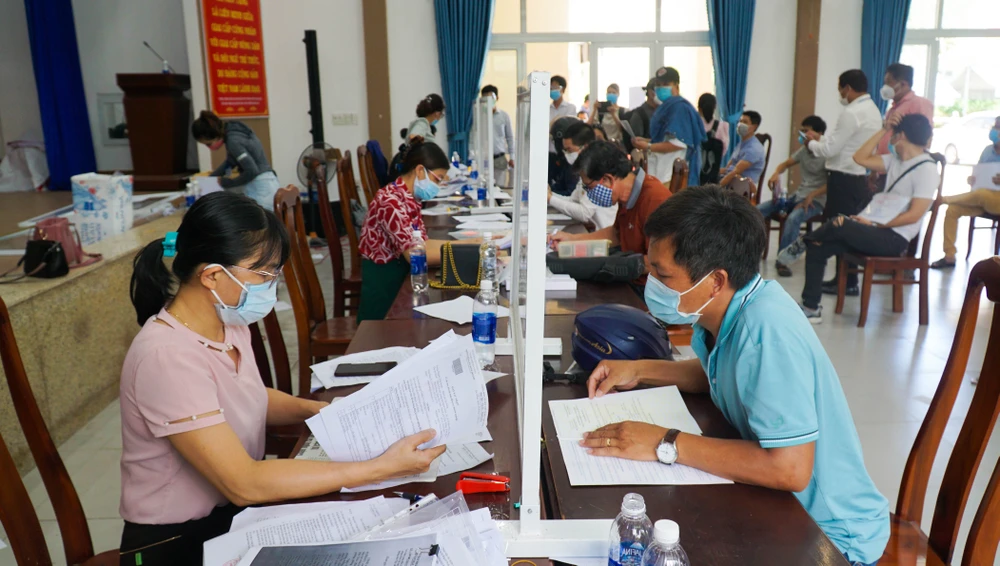 Người dân làm thủ tục cấp giấy đi đường tại UBND phường Hòa Minh (quận Liên Chiểu). Ảnh: B.T.
