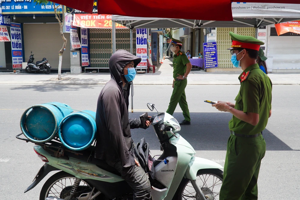 Công an kiểm tra giấy đi đường của người dân tại chốt kiểm soát trên đường Lê Duẩn. Ảnh: B.T.
