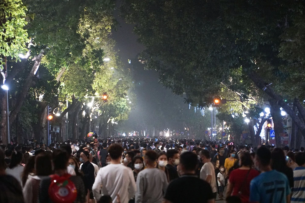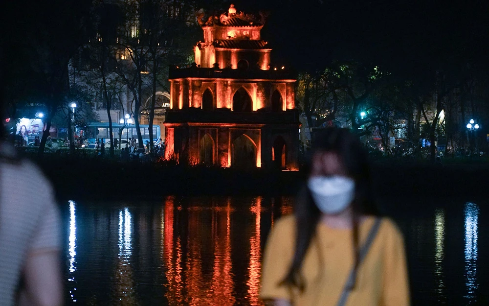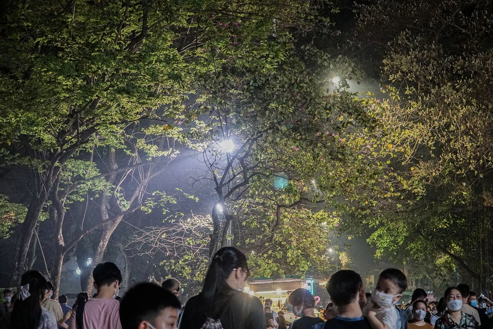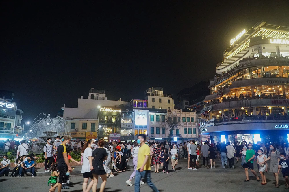 Ghi nhận trên phố đi bộ ở khu vực bờ hồ Hoàn Kiếm, TP Hà Nội vào tối ngày 26-3, người dân chen chân để vào đây đi dạo. Đây là tuần thứ hai phố đi bộ mở cửa trở lại sau gần một năm đóng cửa vì dịch bệnh.