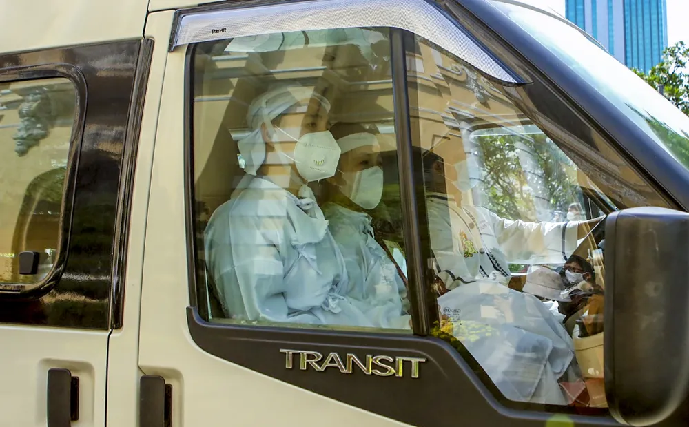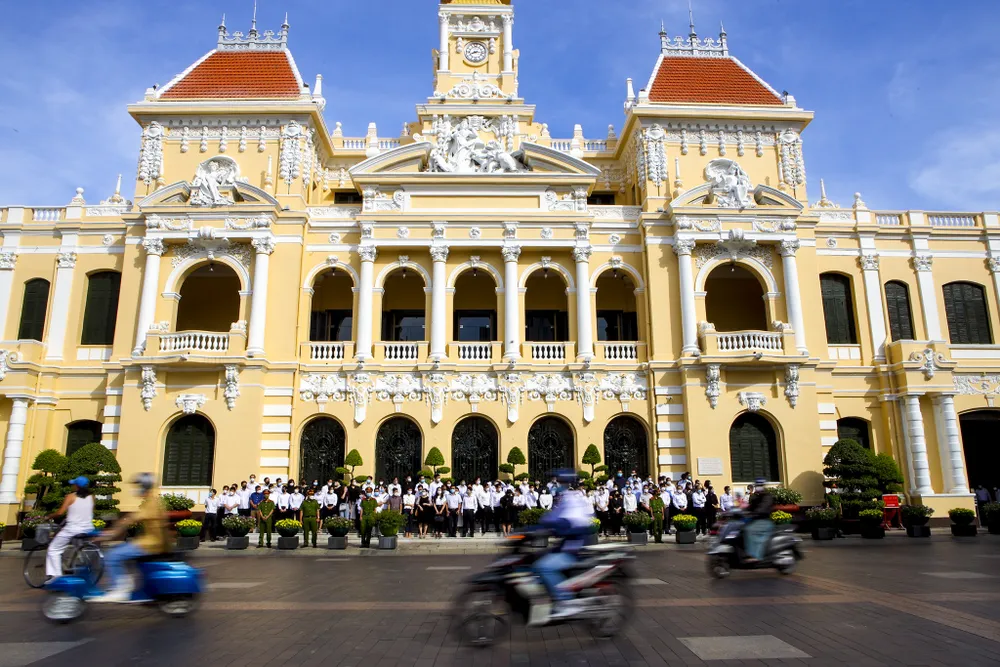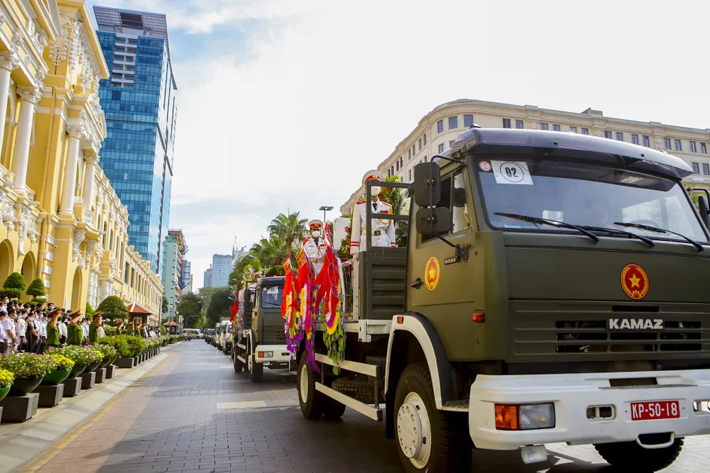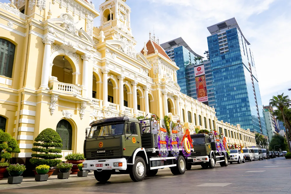 Đoàn xe lặng lẽ di chuyển qua toà nhà UBND TP.HCM trong niềm tiếc thương vô hạn.