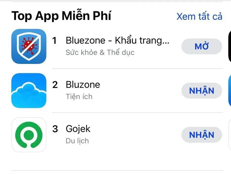 Ghi nhận vào chiều 5 -8 tại kho ứng dụng App store của Apple, số lượt tải ứng dụng Bluzone xếp nhiều thứ hai tại Việt Nam, chỉ thấp hơn so với ứng dụng truy vết Bluezone.