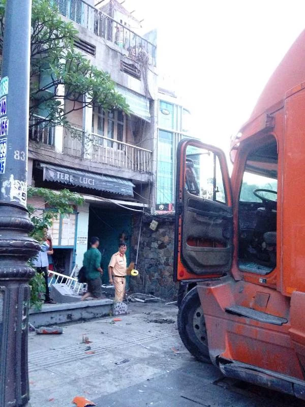 Chiếc xe container lao vào nhà dân bên đường Nguyễn Văn Trỗi sáng 9-6 (ảnh do người dân cung cấp).
