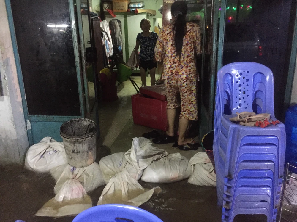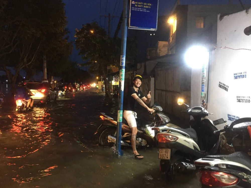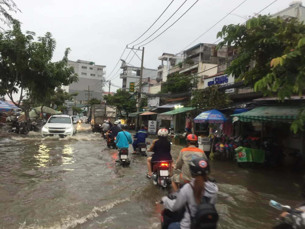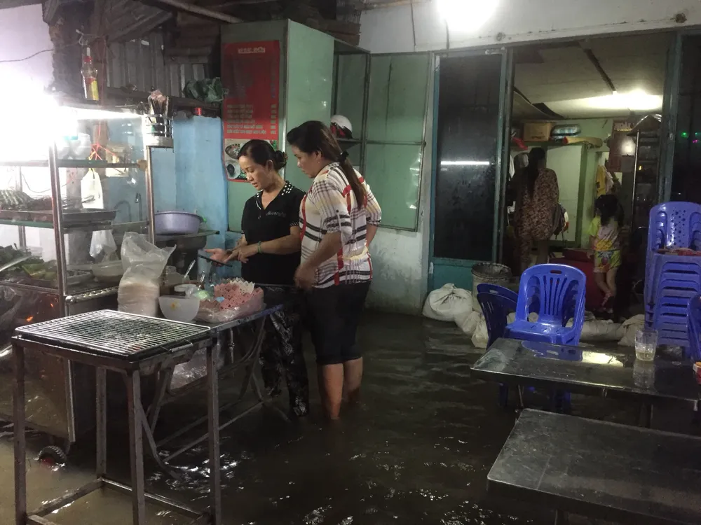 Ghi nhận tại đường Trần Xuân Soạn quận 7, từ 17 giờ chiều nước bắt đầu dâng và tràn qua các tuyến kè kênh và tràn lên đường khiến các phương tiện lưu thông qua lại bị chết máy, giao thông gặp nhiều khó khăn.