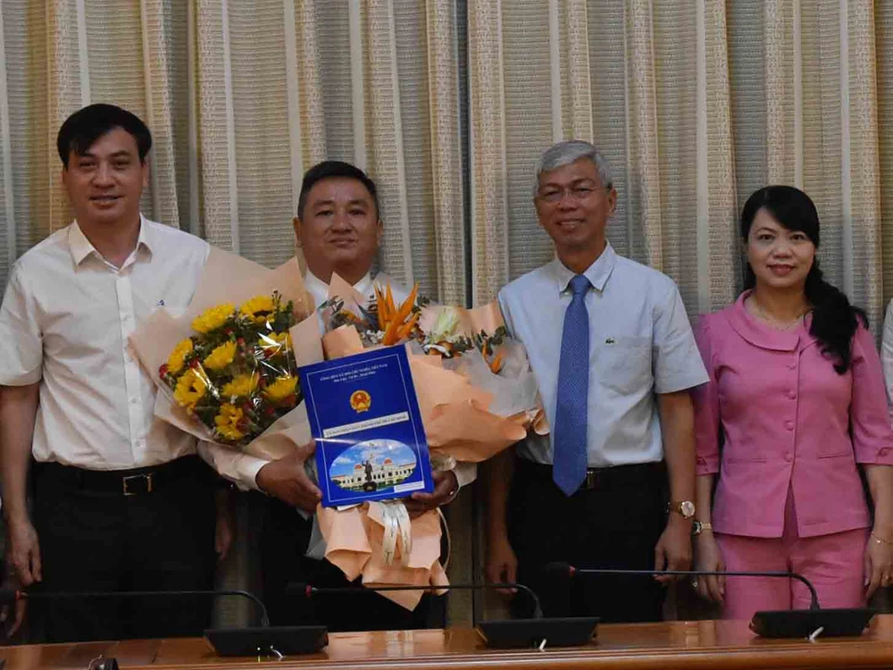 Lãnh đạo TP.HCM trao quyết định và tặng hoa chúc mừng ông Đặng Phú Thành. Ảnh: PHƯƠNG THÙY