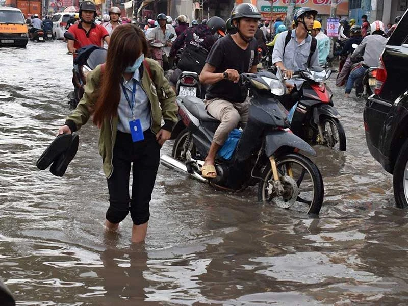 Nhiều người chấp nhận lội qua đoạn đường ngập ở khu Nguyễn Xí để đi làm. Ảnh: N.TRÀ