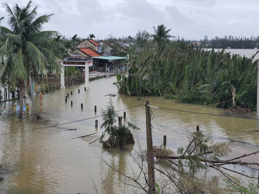 Cây cầu bắt qua sông Trường ngập sâu gần 3m khiến tuyến đường lên các xã Trà Giáp, Trà Bui, Trà Tân và huyện Nam Trà My chia cắt. Huyện này đã di đòi gần 2.000 người có nguy cơ sạt lở đến nơi an toàn.
