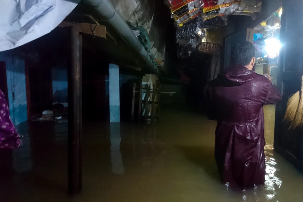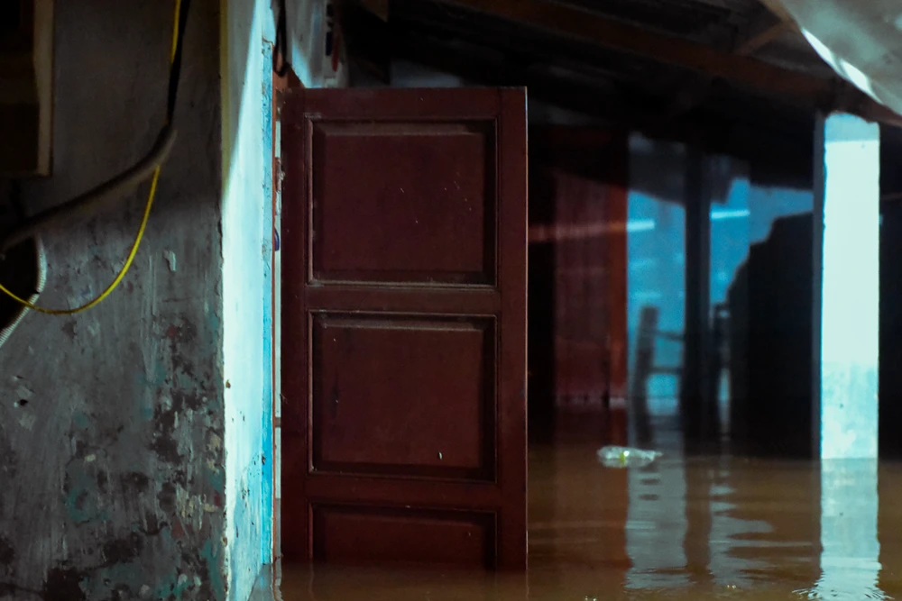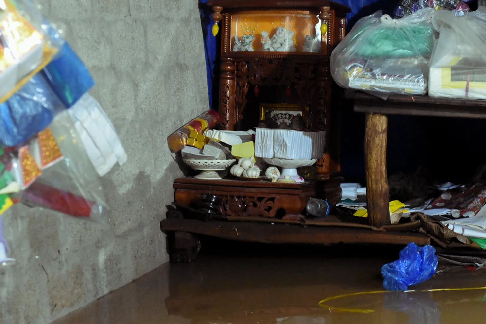 Nhà bị ngập sâu, nhiều đồ đạc được người dân di tản đến nơi cao hơn để giảm thiểu hư hỏng. Ảnh: NGUYỄN DO