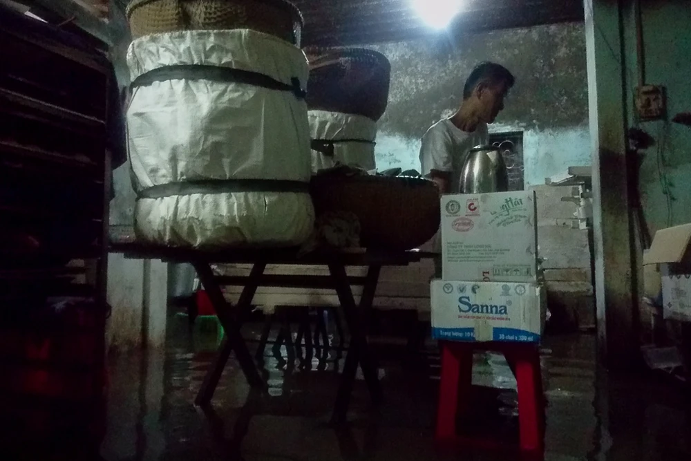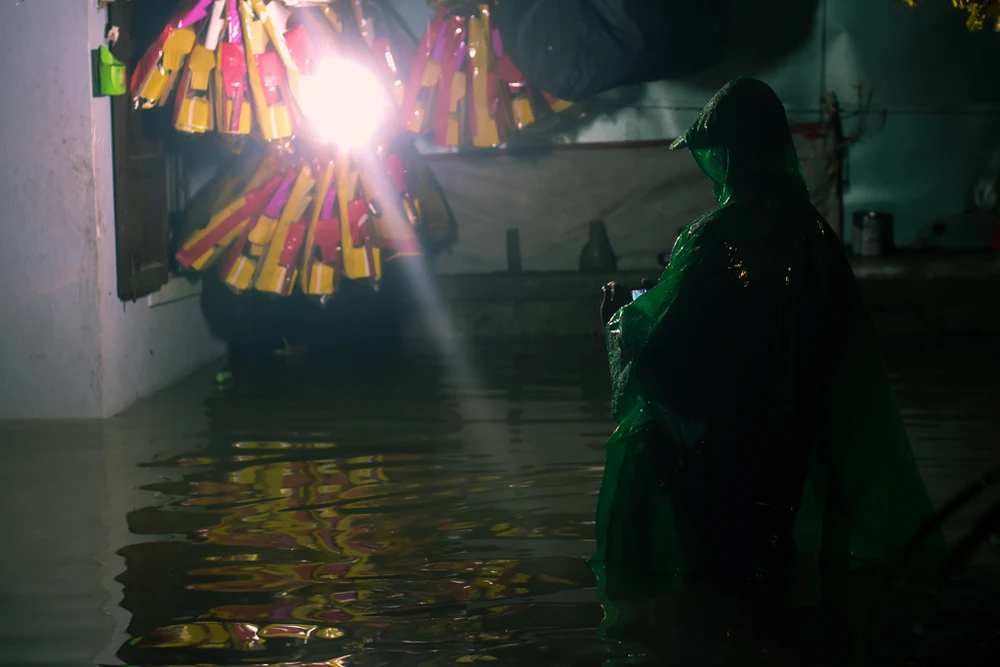 Người dân dù được di tản nhưng nửa đêm thường xuyên ra vào nhà để kiểm tra và dọn dẹp đồ đạc khi nước đang rút dần. Ảnh: NGUYỄN DO