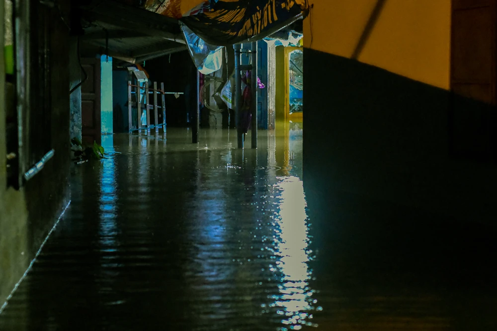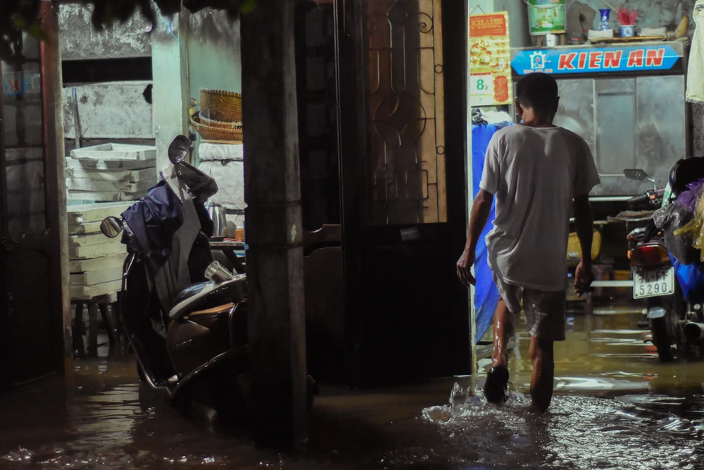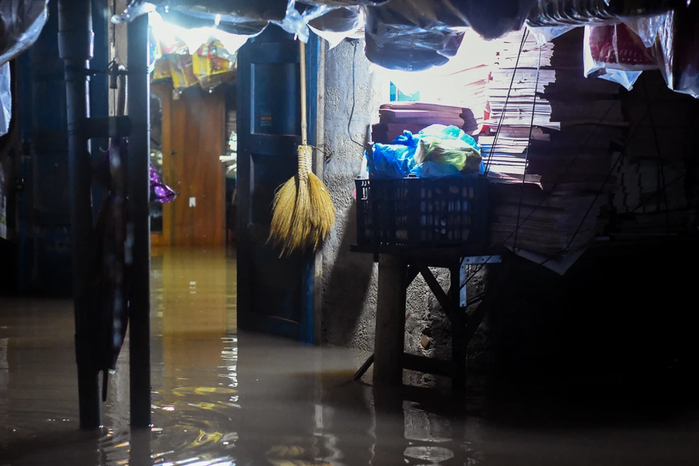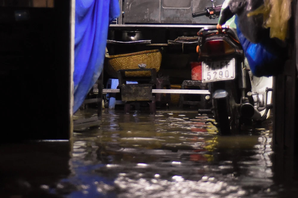 Nhiều hộ gia đình nằm sâu trong các hẻm, đến rạng sáng nay nước vẫn còn ngập sâu khoảng 0,5 m, đồ đạc trôi vãi khắp nơi. Ảnh: NGUYỄN DO