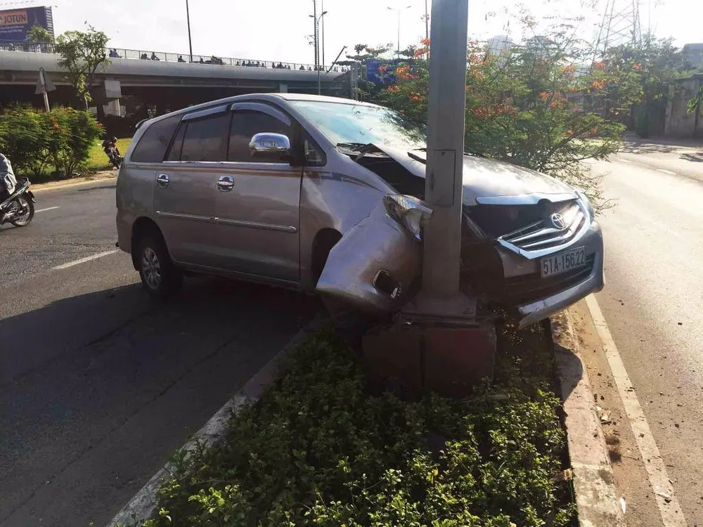 Khi vừa đi ngang qua cầu Sài Gòn (phường 22, quận Bình Thạnh) thì bất ngờ lao qua bên trái, leo lên dải phân cách rồi tông vào cột đèn chiếu sáng công cộng mà nguyên nhân là do dầu nhớt đổ tràn trên đường khiến tài xế mất lái. Sự cố làm phần đầu xe bảy chỗ bị hư hỏng nặng.