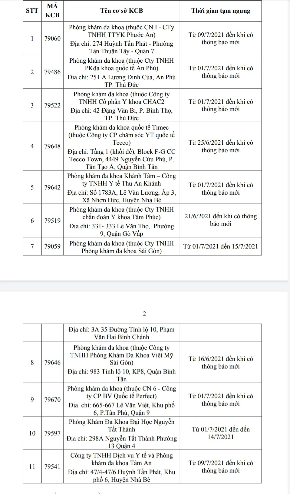 2. Các cơ sở khám chữa bệnh chuyển đổi công năng thành bệnh viện điều trị bệnh COVID-19, ngưng khám chữa bệnh BHYT: