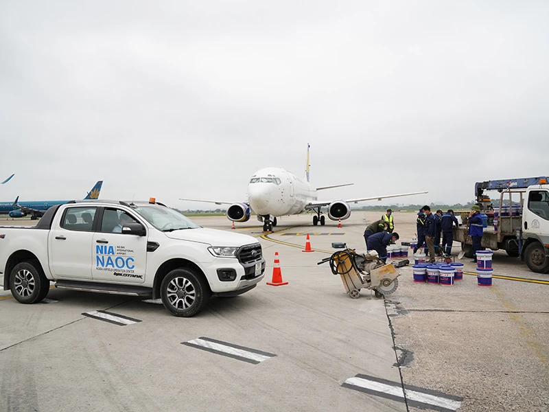 Đợt trước, các công nhân đã tiến hành trám vá trên đường lăn S2 sân bay Nội Bài. Ảnh: VIẾT LONG