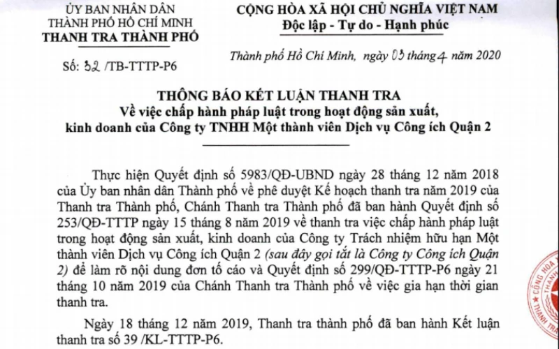 Thanh tra TP.HCM vừa có thông báo kết luận thanh tra về việc chấp hành pháp luật trong hoạt động sản xuất, kinh doanh của Công ty TNHH MTV Dịch vụ công ích quận 2.