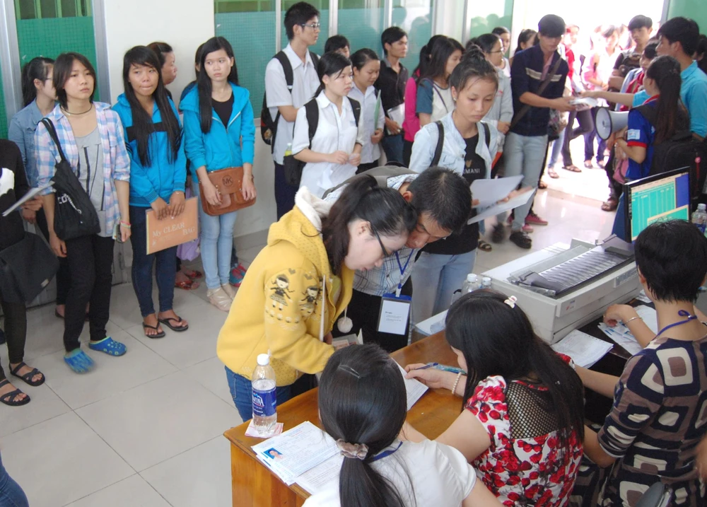 Nhiều thí sinh đến điểm thi để làm thủ tục khá sớm. Các giám thị đang kiểm tra lại thông tin của thí sinh. Thí sinh đang nghe phổ biến quy chế. Thí sinh chỉnh sửa sai sót thông tin tại Phòng Đào tạo trường ĐH KHXH&NV TP.HCM. Sự lo lắng thể hiện rõ trên khuôn mặt của các thí sinh.