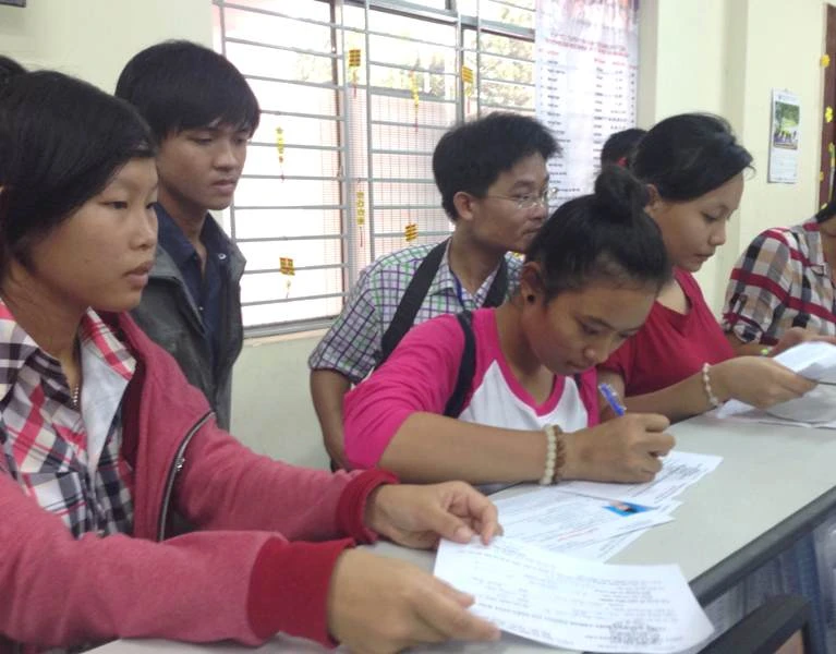 Các thí sinh đang điều chỉnh những sai sót trong hồ sơ đăng ký dự thi tại trường ĐH KHXH&NV TP.HCM.