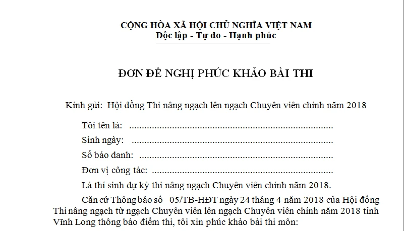Hội đồng thi nâng ngạch từ chuyên viên lên ngạch chuyên viên chính năm 2018 tỉnh Vĩnh Long cũng thông báo sẽ nhận đơn đề nghị phúc khảo bài thi đến ngày 10-5-2018.