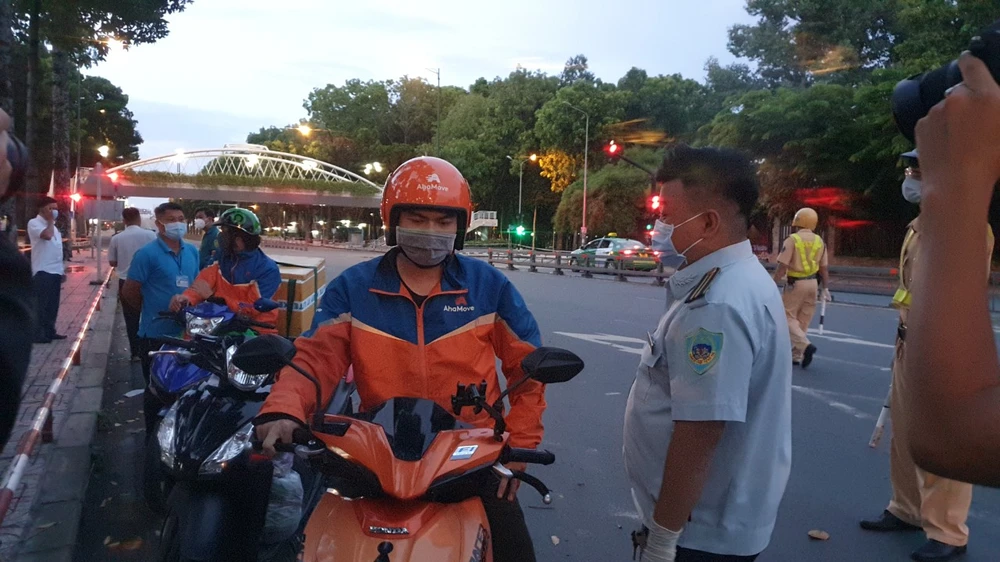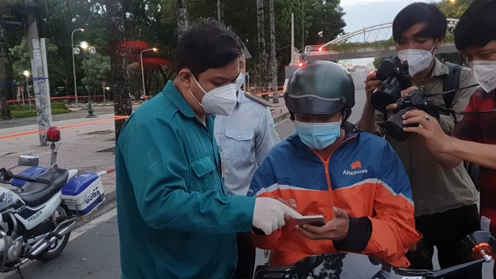 18 giờ 20, lực lượng chức năng chốt kiểm soát kiểm tra một shipper hãng AhaMove. Tài xế này cho biết mình tên TVH, đang trên đường đi giao hàng và nhận chuyến lúc 17 giờ. Một cán bộ hỏi: “Anh có biết quy định là sau 18 giờ không được ra đường không?”. Anh H. trả lời: “Công ty có thông báo được chạy nên tôi mới chạy”.