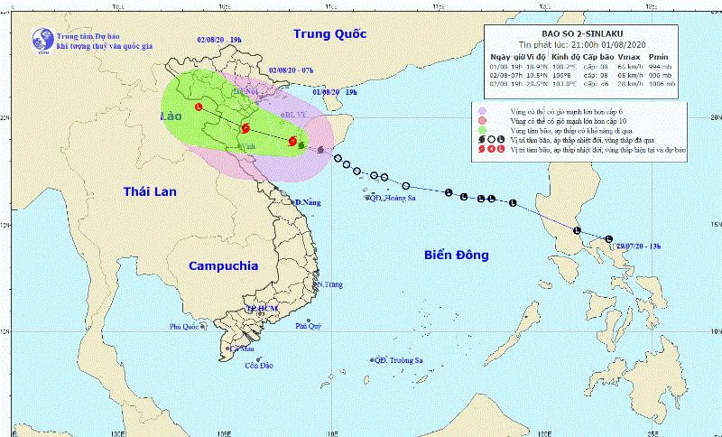 Trung tâm Dự báo Khí tượng thủy văn quốc gia cho biết, vào 19h tối nay, 1-8, tâm bão số 2 còn cách bờ biển các tỉnh Thái Bình - Nghệ An 280km về phía đông nam. Cường độ bão mạnh cấp 8, giật cấp 10.