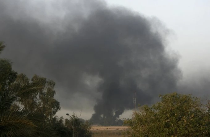 Khói bốc lên sau khi tên lửa nã vào khu vực quận Jadiriya, gần Vùng Xanh, nơi có Đại sứ quán Mỹ ở Baghdad, Iraq. Ảnh: TWITTER