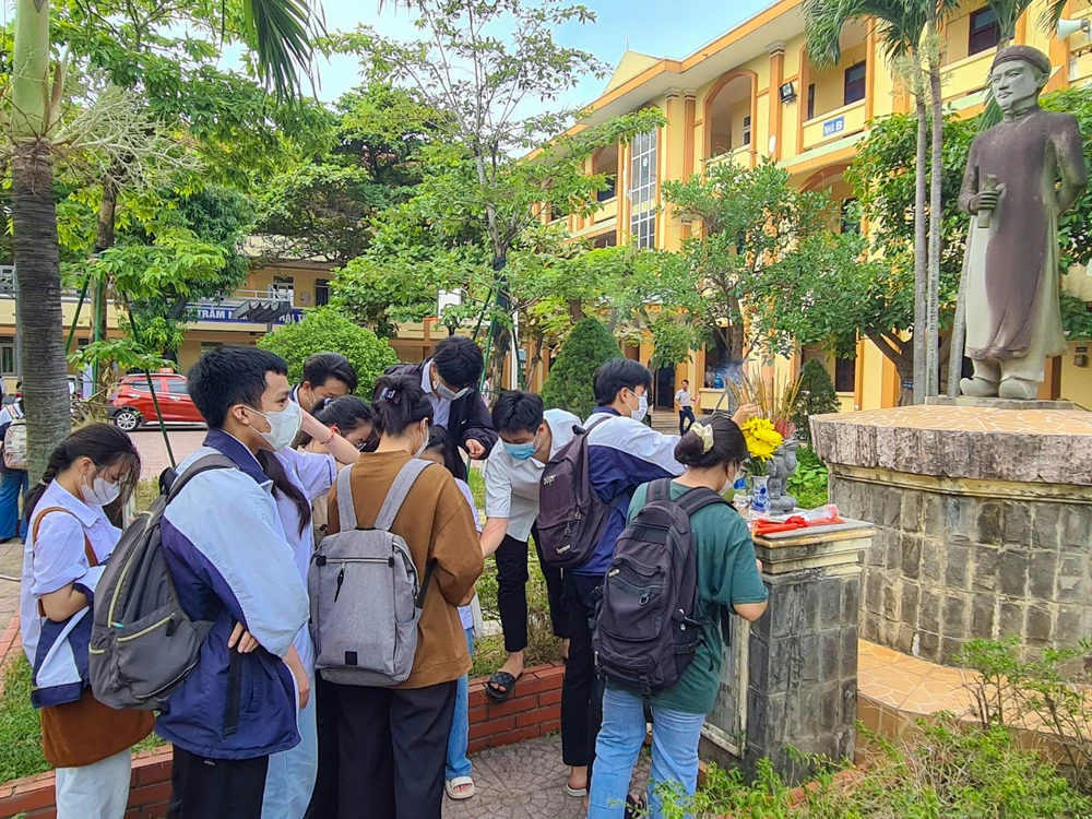 Tại điểm trường THPT Đào Duy Từ (TP Đồng Hới), có 601 thí sinh dự thi kỳ thi tốt nghiệp THPT 2023. Đáng chú ý, sau khi làm thủ tục dự thi và được giáo viên phổ biến quy chế thi, nhiều thí sinh đã đến dâng hương trước tượng cụ Đào Duy Từ trong khuôn viên trường để cầu may.