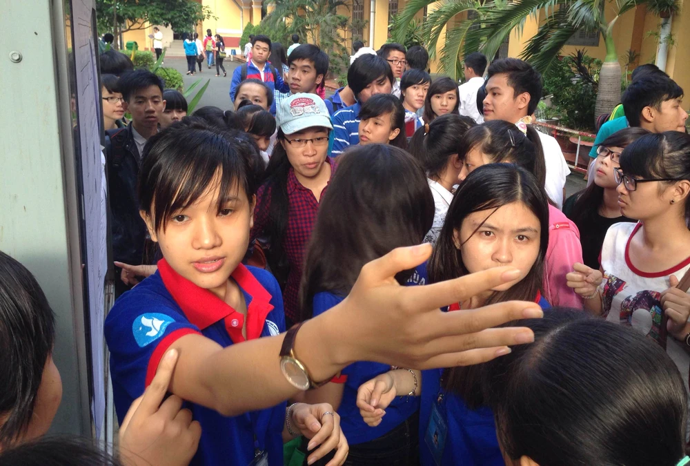 Một thí sinh đến làm thủ tục trễ. Giám thị phải nhắc nhỡ thí sinh ngày mai phải đến sớm để dự thi.