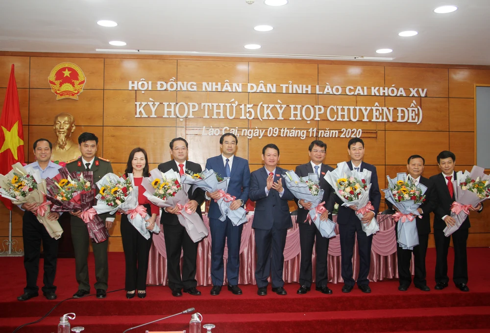 Tặng hoa chúc mừng các đồng chí được kỳ họp bầu giữ các chức danh HĐND, UBND tỉnh Lào Cai. Ảnh: VGP